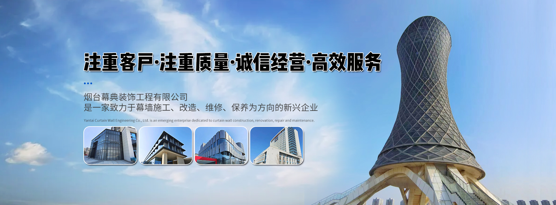 煙臺幕典裝飾工程有限公司是一家致力于幕墻施工、改造、維修、保養為方向的新興企業。公司成立于2017年,公司擁有技術骨干10余人,安裝施工人員60余人。主要技術人員從事幕墻行業20多年,對于玻璃、石材、金屬三種類型幕墻的制作、安裝、改造、維修,積累了豐富的寶貴經驗。我們隨時掌握著幕墻技術的新發展,通過現場勘察快速分析出幕墻破損及滲漏的主要原因,根據客戶需求量身制定快捷、經濟、有效的解決...